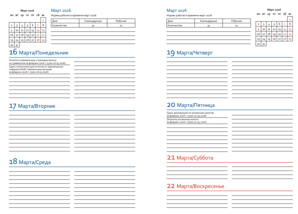 - место для собственных записей, что дает возможность четко планировать свой рабочий график;